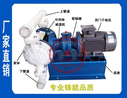 DBY型電動隔膜泵是國內電動隔膜泵的標志,大家一提到電動隔膜泵就會想到DBY系列。電動DBY型隔膜泵通過BLY系列擺線針輪減速機帶動泵體左右兩端柱塞上的隔膜片左右往復運動。在左右兩個泵腔里裝有上下四個單項球閥,隔膜片的左右運動使泵腔內的容積產生有規律的改變。迫使四個單項球閥交替的開啟和關閉,從而將液體吸入和排出產生流體。