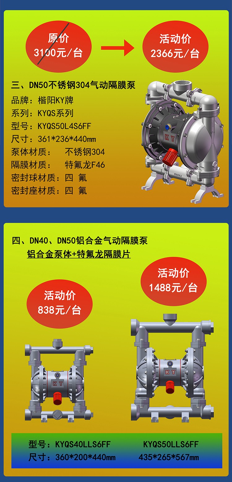 本期活動為楷陽氣動隔膜泵四大系列中的KYQS輕巧靈便系列產品,九大材質中的不銹鋼304和鋁合金材質產品,詳情請仔細閱讀以下細則: