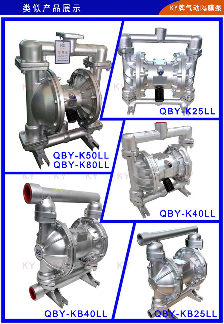 QBY-K50LL鋁合金氣動(dòng)隔膜泵是第四代氣動(dòng)隔膜泵,它以壓縮空氣為動(dòng)力;當(dāng)壓縮氣體進(jìn)入中間馬達(dá)體,馬達(dá)體會(huì)將壓縮氣體壓入隔膜泵其中一腔從而推動(dòng)隔膜片運(yùn)動(dòng)擠壓液體流出,同時(shí)隔膜泵的另一腔因?yàn)楸焕龆胍后w。當(dāng)隔膜片到達(dá)終點(diǎn),配氣閥機(jī)構(gòu)自動(dòng)將壓縮空氣引入泵腔另一端,推動(dòng)隔膜片朝相反方向運(yùn)動(dòng),從而使隔膜片在泵體的兩個(gè)腔做往復(fù)運(yùn)動(dòng),抽動(dòng)液體流動(dòng)。上海楷陽為方便客戶使用,第四代QBY-K50LL氣動(dòng)隔膜泵已經(jīng)研發(fā)了十余種材質(zhì)生產(chǎn):鑄鐵氣動(dòng)泵、鋁合金氣動(dòng)隔膜泵、不銹鋼304氣動(dòng)隔膜泵、不銹鋼316L氣動(dòng)隔膜泵、工程塑料(增強(qiáng)聚丙烯)氣動(dòng)隔膜泵、氟塑料(PVDF)氣動(dòng)隔膜泵和耐腐蝕抗壓性能超強(qiáng)的鋼襯氟氣動(dòng)泵等。